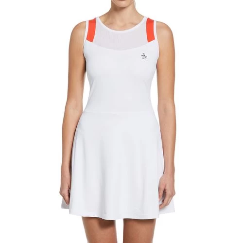Strut your style on the courts this spring in the classic silhouettes and retro printed designs of the Penguin Women’s Spring 2023 Collection. The Penguin Illusion Mesh Dress features a high neckline, illusion mesh detailing, a built-in shelf bra, and includes ball shorts. Made with stretchy, moisture-wicking fabric.