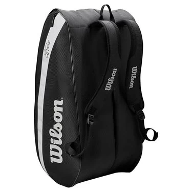 Grab the latest Federer Team 12 Pack bag today! This awesome Roger Federer Team from Wilson Sports, features two large main compartments which have the ability to hold up to 12 uncovered racquets. The bag also features two exterior side pockets for personal storage. Comfortable carry with grab handle and comfortable padded adjustable backpack straps. Screen printed Roger Federer’s signature featured.